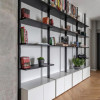 Man cave monocrom plus câteva griuri colorate. Design simplu, curat, 3 stâlpi cu beton aparent realizați, mobilier IKEA & IKEA hack cu câteva mărunțișuri custom și montaj artizanal integral în regie proprie.